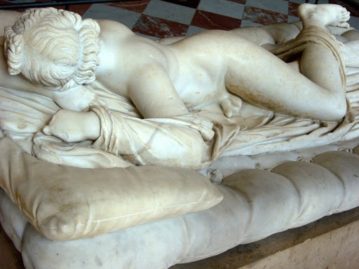 The Sleeping Hermaphroditus, life-size Roman sculpture, seen from the front. The three Roman versions are copies of an earlier 2nd century BC Hellenistic bronze.