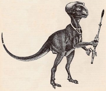 A dinosaur wearing jewellery, carrying a ray gun, and thinking about nuclear holocaust (John McLaughlin 1984).